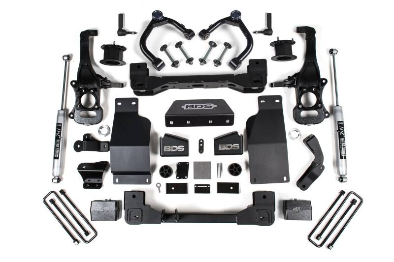 In the rear BDS offers a heavy duty lift block to lift and level that stance. The lift block installs in place of the stock block and retains ride quality and load capacity. Also for the rear are new u-bolts, brake line brackets and precision tuned NX2 Nitro or premium FOX 2.0 Performance Series shocks.