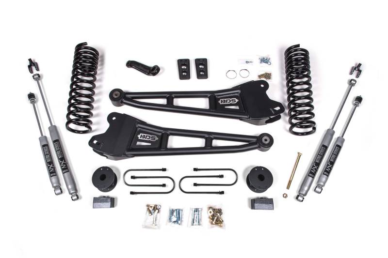 Upgrade the ride and style of your 2013-2018 RAM 3500 gas powered truck equipped with factory rear air ride by installing this 4-inch radius arm lift kit from BDS Suspension. Designed to improve stance, performance, and capability, this kit includes everything necessary to set your truck up right with clearance for up to 35" tires.