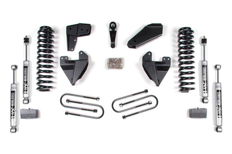 In the rear the base kit utilizes a high-strength lift block, longer u-bolts and a matching set of NX2 Nitro shocks.