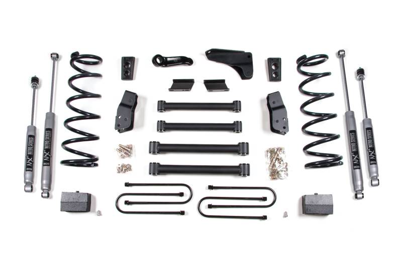 Up front the lift kit includes gas-specific Pro-Ride coil springs, all four control arms plus relocation bracket, forged drop pitman arm and track bar bracket for steering correction, bump stops, sway bar links, and precision tuned NX2 or FOX 2.0 nitrogen charged shocks. In the rear this kit utilizes heavy duty cast steel blocks, longer u-bolts, and a matching set of NX2 Nitro or FOX 2.0 Performance shocks.
