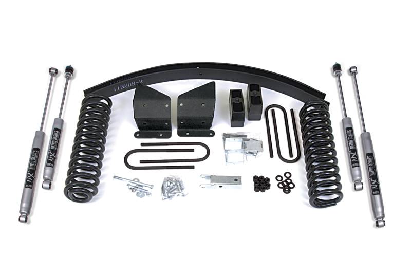 In the rear the base kit utilizes a high-strength lift block, longer u-bolts and a matching set of NX2 Nitro shocks.