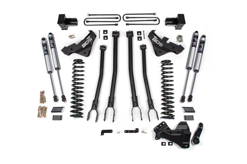 Upgrade your 2023–2026 Ford F-450 with the BDS 4" 4-Link Lift Kit, engineered for strength, stability, and premium ride quality whether you’re towing, hauling, or exploring off-road. This system replaces the factory radius arms with a heavy-duty 4-link setup that improves axle control, reduces binding, and delivers smoother suspension movement throughout the entire range of travel. While radius-arm kits offer excellent simplicity and durability, the 4-link design takes performance a step further by providing more consistent caster angles, enhanced articulation, and improved tracking under acceleration and braking, especially noticeable in larger Super Duty platforms like the F-450. To match the suspension performance you’re after, BDS offers multiple shock options: the dependable BDS NX2 shocks, the upgraded FOX 2.0 Performance Series, and the premium FOX 2.5 Performance Elite shocks featuring DSC (Dual Speed Compression) adjusters for precise tuning on or off road. For those seeking the ultimate setup, the system can also be ordered with front FOX 2.5 Performance Elite coilovers for exceptional responsiveness, control, and damping consistency. Whether you’re building a workhorse or a weekend adventure truck, this kit delivers the perfect blend of ride quality, capability, and durability.