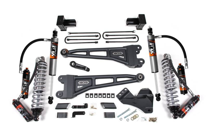 Give your 2023–2026 Ford F-450 the lift it deserves with the BDS 4" Radius Arm Lift Kit, an ideal choice for drivers who want strength, simplicity, and outstanding everyday performance. While 4-link systems offer excellent articulation and fine-tuned geometry, a radius-arm setup shines when it comes to durability, straightforward design, and long-term reliability, qualities especially valued on heavy-duty trucks like the F-450. The heavy-duty radius arms from BDS are built to handle serious workload demands while maintaining predictable road manners, confident steering feel, and excellent stability under towing and hauling. This kit pairs perfectly with front FOX 2.5 Performance Elite coilovers to deliver maximum responsiveness and comfort. Rugged, dependable, and easier on the budget, this BDS Radius Arm Lift Kit is the smart choice for drivers who want reliable performance without over complicating their suspension.