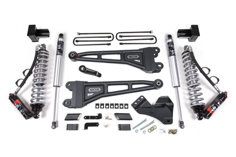 Give your 2023–2026 Ford F-450 the lift it deserves with the BDS 4" Radius Arm Lift Kit, an ideal choice for drivers who want strength, simplicity, and outstanding everyday performance. While 4-link systems offer excellent articulation and fine-tuned geometry, a radius-arm setup shines when it comes to durability, straightforward design, and long-term reliability, qualities especially valued on heavy-duty trucks like the F-450. The heavy-duty radius arms from BDS are built to handle serious workload demands while maintaining predictable road manners, confident steering feel, and excellent stability under towing and hauling. This kit pairs perfectly with front FOX 2.5 Performance Elite coilovers to deliver maximum responsiveness and comfort. Rugged, dependable, and easier on the budget, this BDS Radius Arm Lift Kit is the smart choice for drivers who want reliable performance without over complicating their suspension.